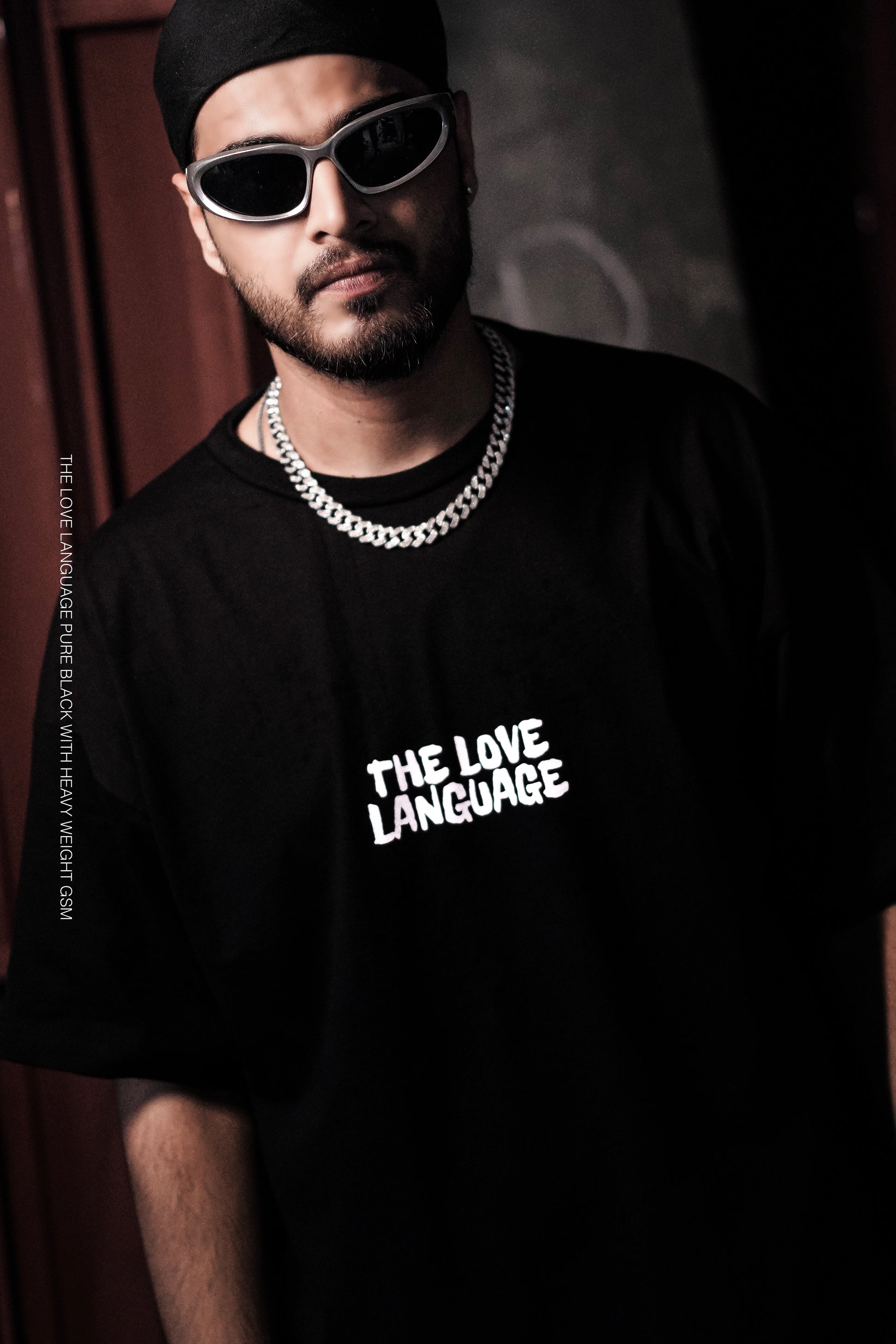It’s an oversized t-shirt in jet black color featuring ‘The Love Language’ print. The front has ‘The Love Language’ written on it, and the back showcases a bold design with ‘The Love Language’ text, done in screen printing.